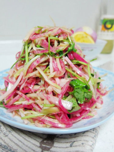 取一個綠皮水果蘿卜,去皮,切絲,加入少許調(diào)料,拌勻即可,做法簡單,味道不錯。在調(diào)料上,加入少許橙汁或檸檬汁,讓蘿卜入口后口感更豐富而有層次,有著淡淡的橙子香氣。
