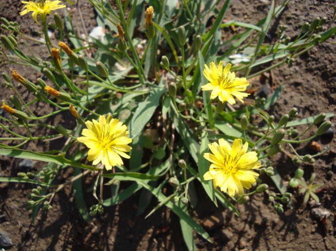 原生形態(tài):抱莖苦荬菜多年生草本,高可達(dá)1米許。根粗壯而垂直。莖直立。根生葉排成蓮座狀,葉片長圓狀倒披針形,倒向羽裂狀或羽狀缺刻,先端短尖或鈍圓,基部慚狹成柄,花期通常不萎落;莖生葉基部抱莖。頭狀花序排成傘房狀;總苞圓摘狀,外層苞片極短小,內(nèi)層苞片線狀披針形;花黃色,全部為舌狀花,先端5齒裂;花柱細(xì)長,柱頭2裂,冠毛白色,一層。瘦果紡錘形,稍扁,果喙長約為瘦果的1/4,通常與瘦果不同色。花期春季。生于山腳、路邊、疏林內(nèi)、河邊。