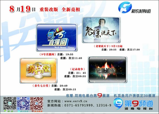 8月19日新農村頻道全新亮相!19:35《9號直播間》;20:40《養(yǎng)生七日堂》;21:45《記錄戰(zhàn)爭》;四檔電影,視覺盛宴!14:43《第9放映室午間版》,17:55《群影匯》,22:00《第9放映室》,23:50《午夜影吧》,河南9套好電影,精彩不斷連連看!