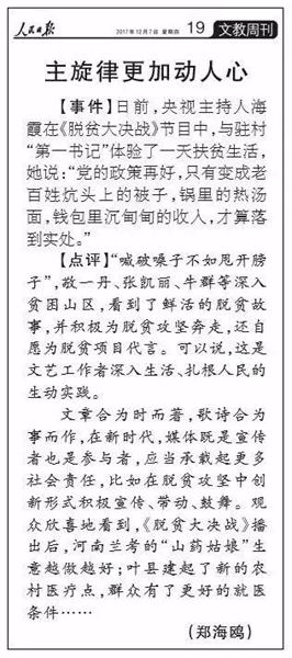 作為十九大的重要獻禮篇,《脫貧大決戰(zhàn)》第二季于10月11日正式播出。從第一季的“認(rèn)識貧困、了解貧困”,到第二季的“幫扶貧困、解決貧困”,固本求新,展現(xiàn)扶貧工作的現(xiàn)實意義和顯著成效,彰顯河南在全國脫貧攻堅中的責(zé)任和擔(dān)當(dāng)。節(jié)目播出之后,《光明日報》刊發(fā)《“土氣”背后的擔(dān)當(dāng)精神——關(guān)于大型公益扶貧節(jié)目<脫貧大決戰(zhàn)>》?!度嗣袢請蟆钒l(fā)表評論《主旋律更加動人心》,稱贊《脫貧大決戰(zhàn)》是“深入生活、扎根人民的生動實踐”,國務(wù)院扶貧辦、中宣部、省委省政府、省委宣傳部等多個領(lǐng)導(dǎo)對節(jié)目給予充分肯定。