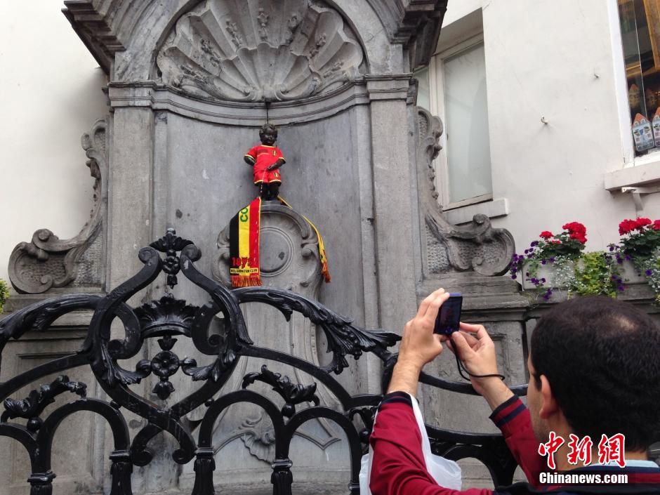 6月17日晚,歐洲“紅魔”比利時(shí)隊(duì)以2比1戰(zhàn)勝巴西世界杯首個(gè)對(duì)手阿爾及利亞隊(duì)。在比利時(shí)首都布魯塞爾,著名的城市標(biāo)志“小尿童”于連雕像換上了比利時(shí)隊(duì)隊(duì)服,并圍上球迷圍巾,化身紅魔球迷支持比利時(shí)隊(duì)。