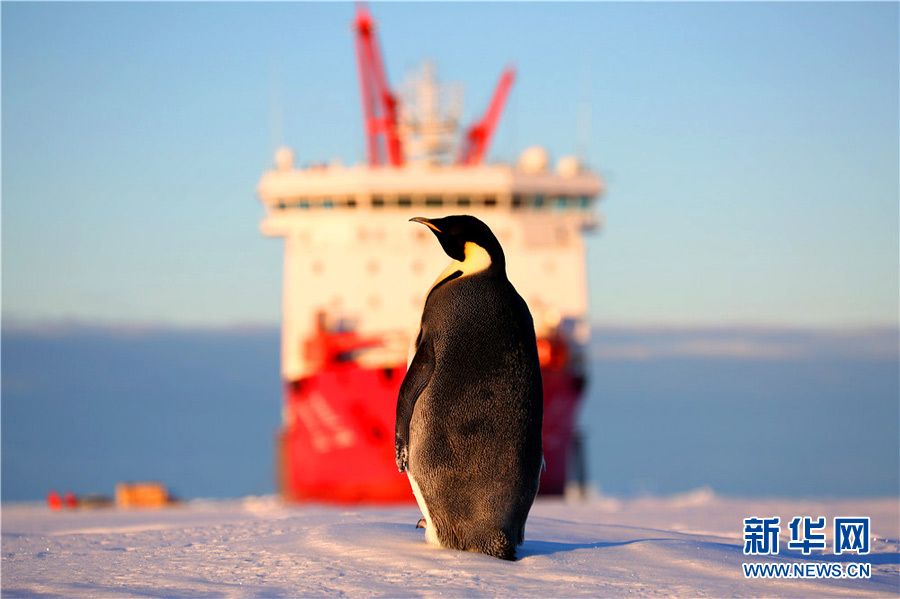 12月7日,一只帝企鵝在展開(kāi)卸貨作業(yè)的“雪龍”號(hào)旁。 “雪龍”號(hào)自12月1日起在中山站外陸緣冰地帶展開(kāi)冰上卸貨作業(yè),預(yù)計(jì)將于12日離開(kāi),前往羅斯海域開(kāi)展大洋調(diào)查。 新華社記者 白陽(yáng) 攝