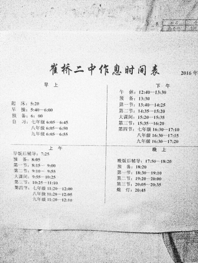 悲痛之余,佳佳的伯伯質(zhì)疑學校規(guī)定的作息時間存在不合理狀況。記者從其提供的該校作息時間表上看到,該校針對所有學生規(guī)定的早上起床時間是凌晨5時20分,早操是5時40分至6時整,然后是早自習。