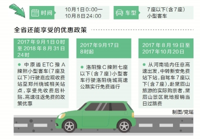 同時,全省還能享受到除高速免費(fèi)以外的其他優(yōu)惠政策:從2017年9月1日0時至2018年8月31日24時,中原通ETC豫A牌照小型客車(7座及以下)行駛嘉應(yīng)觀收費(fèi)站至鄭州繞城相關(guān)站點(diǎn),享受先收費(fèi)后補(bǔ)貼、高速往返免費(fèi)的政策優(yōu)惠;2017年9月17日8時起,洛陽豫C牌照7座以下(含7座)小型客車行駛洛陽繞城高速公路實(shí)行免費(fèi)通行;2017年8月19日至2017年10月20日,從河南境內(nèi)任意高速出發(fā),中轉(zhuǎn)新安縣下站,自駕7座以下(含7座)小型客車赴黛眉山旅游的實(shí)際購票者,黛眉山景區(qū)就地報(bào)銷當(dāng)日過路費(fèi)。